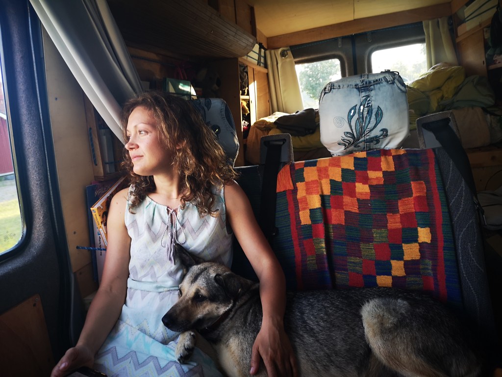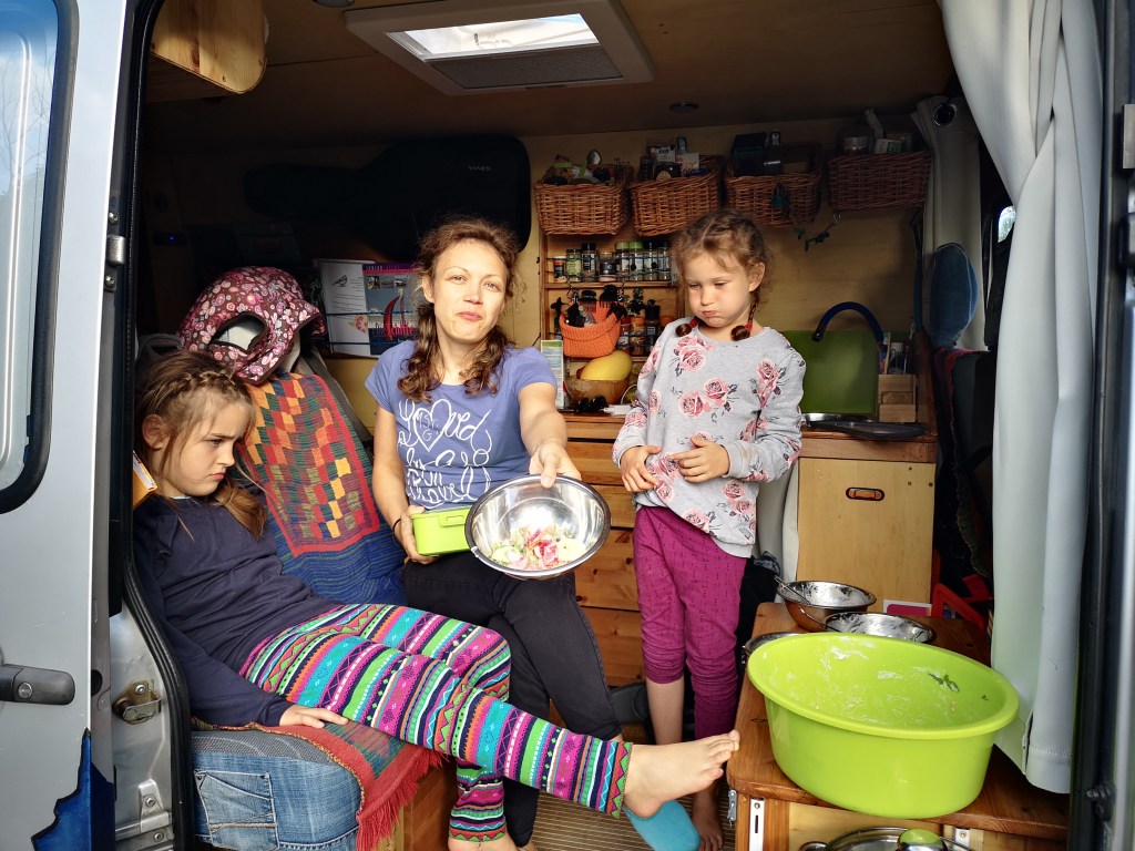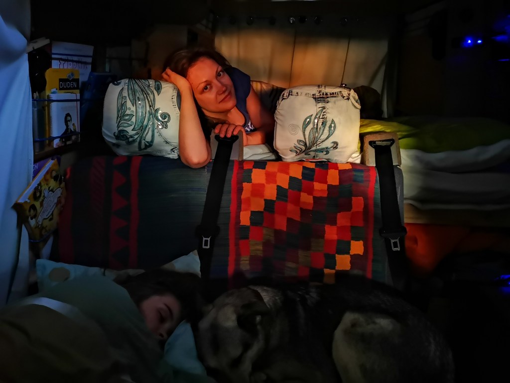 Dafür überwiegen die Vorteile von einem kleinen Fahrzeug, das wir über viele Straßen und an viele Plätze fahren können, wo ein Wohnmobil nicht hinkommt. Wir können einfach einparken und auch schnell Strecke zurück legen, wenn wir wollen. Zum Glück sind unsere Kinder nicht so groß. Die einzige leidende ist unsere Hündin Fiona. Schon immer hatte sie eine große Individualdistanz und mag es einfach nicht, wenn es eng wird. Tagsüber sucht sie sich lieber draußen ein Plätzchen. Wir achten darauf sie nicht einzuengen, ihr das so gut es geht gemütlich einzurichten und hoffen, dass ihr verzweifelter Blick bald nachlässt.