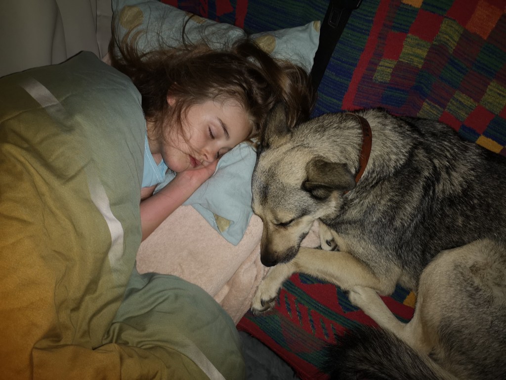 Was sehr positiv ist, wir alle schlafen im Auto sehr gut. Wir haben befürchtet, dass unsere Kinder zu wenig Platz haben werden, beim Schlafen unter unserem Bett. Es ist genau das Gegenteil der Fall. „Die Höhle“ ist der Lieblingsplatz bislang. Der Schlafplatz an der Schiebetür ist aber auch schön, da unser Hund Fiona da auch schläft.